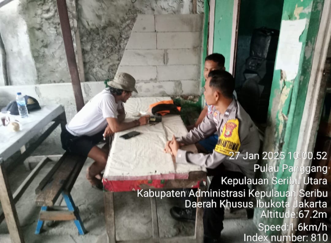 Jakarta – Bhabinkamtibmas Pulau Panggang, Polres Kepulauan Seribu, Aipda Suhendi, melaksanakan kegiatan sambang kepada tokoh masyarakat pada Senin (27/01/2025). Kegiatan ini bertujuan untuk mempererat silaturahmi dan menjalin komunikasi aktif antara masyarakat dan pihak kepolisian dalam menjaga situasi keamanan dan ketertiban masyarakat (kamtibmas).