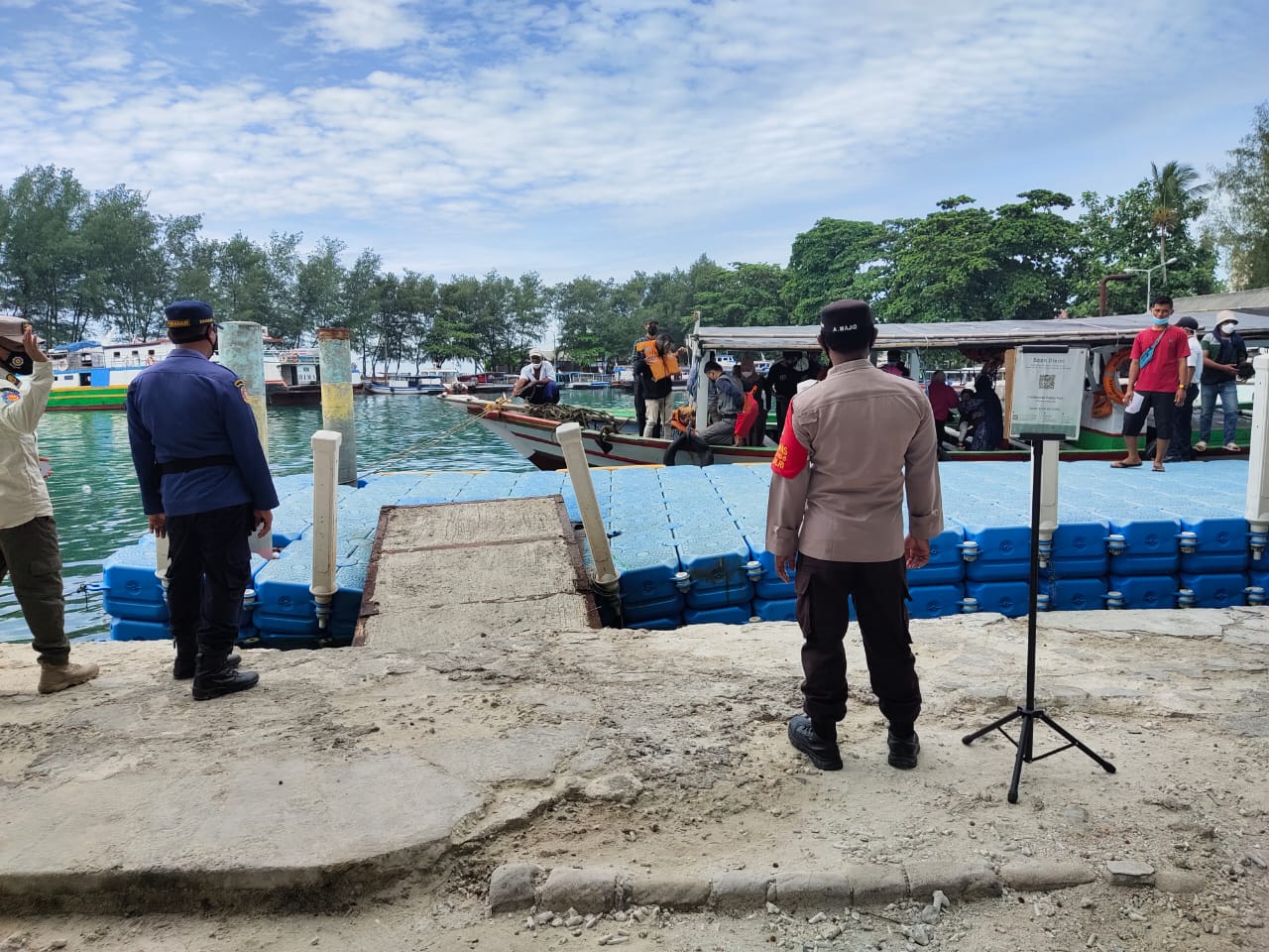 Sejak siang hari personel Polsek Kepulauan Seribu Selatan bersama Tiga Pilar, Tim Satgas COVID-19 setempat sudah berada di Dermaga Keberangkatan pulau pemukiman Pulau Tidung, Pulau Pari, Pulau Lancang dan Pulau Untung Jawa.