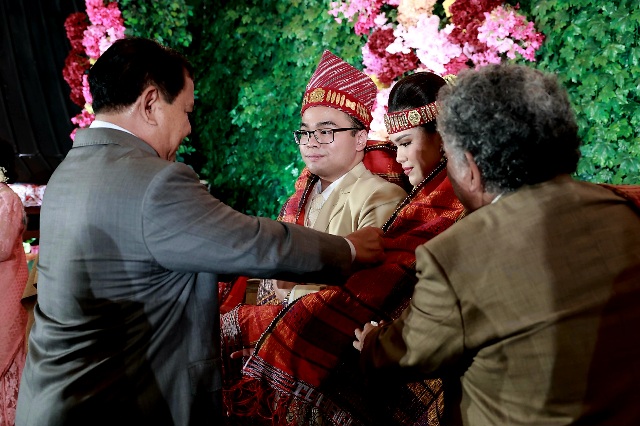 Jakarta, Dekannews - Menteri Pertahanan Prabowo Subianto mengalungi kain ulos kepada putra bungsu Hotman Paris, dalam resepsi pernikahan dan adat b...